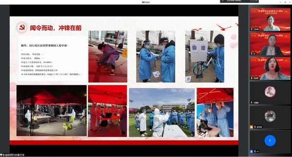 在庄严的国歌声中,大会拉开帷幕。大会第一篇章的主题为“我是党员,我向组织报到”,邀请了五位在校内、在社区抗疫一线的志愿者,讲述了一名普通共产党员在大上海保卫战中的责任与担当。