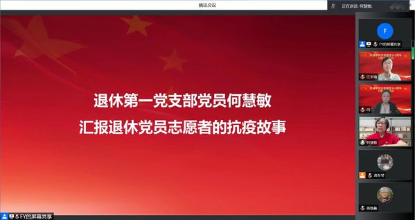 退休第一党支部党员何慧敏分享了退休党员志愿者的抗疫故事。何慧敏老师是一名有着57年党龄的老党员,当疫情发生后,她担任楼组长,主动承担了最后20米的志愿者工作,积极为楼里的居民服务。她说:“一名党员就是一面旗帜。在本轮疫情中,广大党员同志主动亮身份、作表率,参与了社区疫情防控志愿服务。基层党员干部工作做得好不好,直接关系到人民群众对党和政府的信任。只有每位党员干部发挥作用,才能凝心聚力,带领人民群众打赢这场大上海保卫战。”