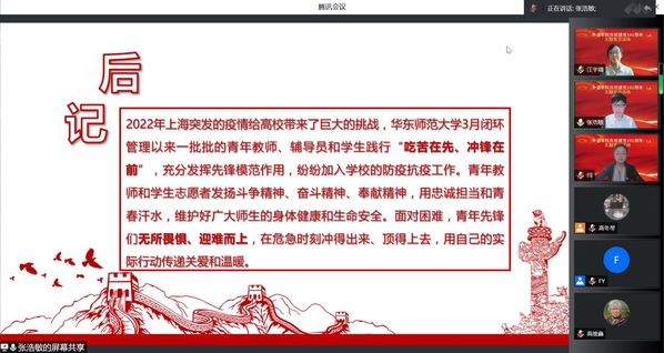英语系、翻译系联合教工党支部预备党员张浩敏以“披荆斩棘,共克时艰”为题,分享了校内教学科研片区的抗疫故事。张浩敏老师在教学科研片区担任外语楼楼长,承担了跨片区送餐、配药等志愿服务。在防疫一线,他深切地感受到作为一名青年党员的责任,他们无所畏惧、迎难而上,在危急时刻冲得出来、顶得上去,用自己的实际行动传递关爱和温暖。