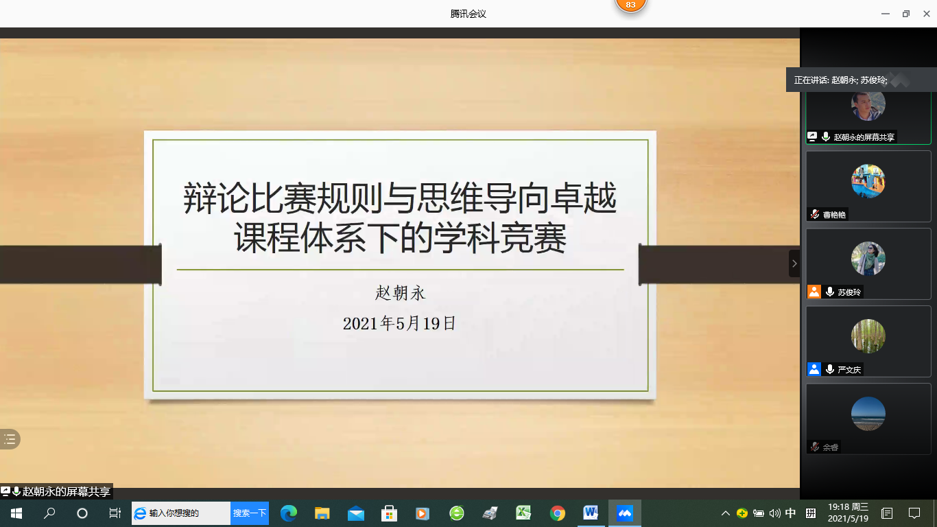 5月19日晚,大学英语教学部在线上召开“辩论比赛规则与思维导向卓越课程体系下的学科竞赛”学术研讨会,重点探讨第一、第二课堂的深度融合、协调发展问题。大学英语党支部书记苏俊玲主持会议,赵朝永老师做主题发言,王越和李辉老师做交流分享,大学英语教学部主任严文庆做总结发言。外院公司副经理朱晓映和大学英语教学部全体教师参加了研讨会。