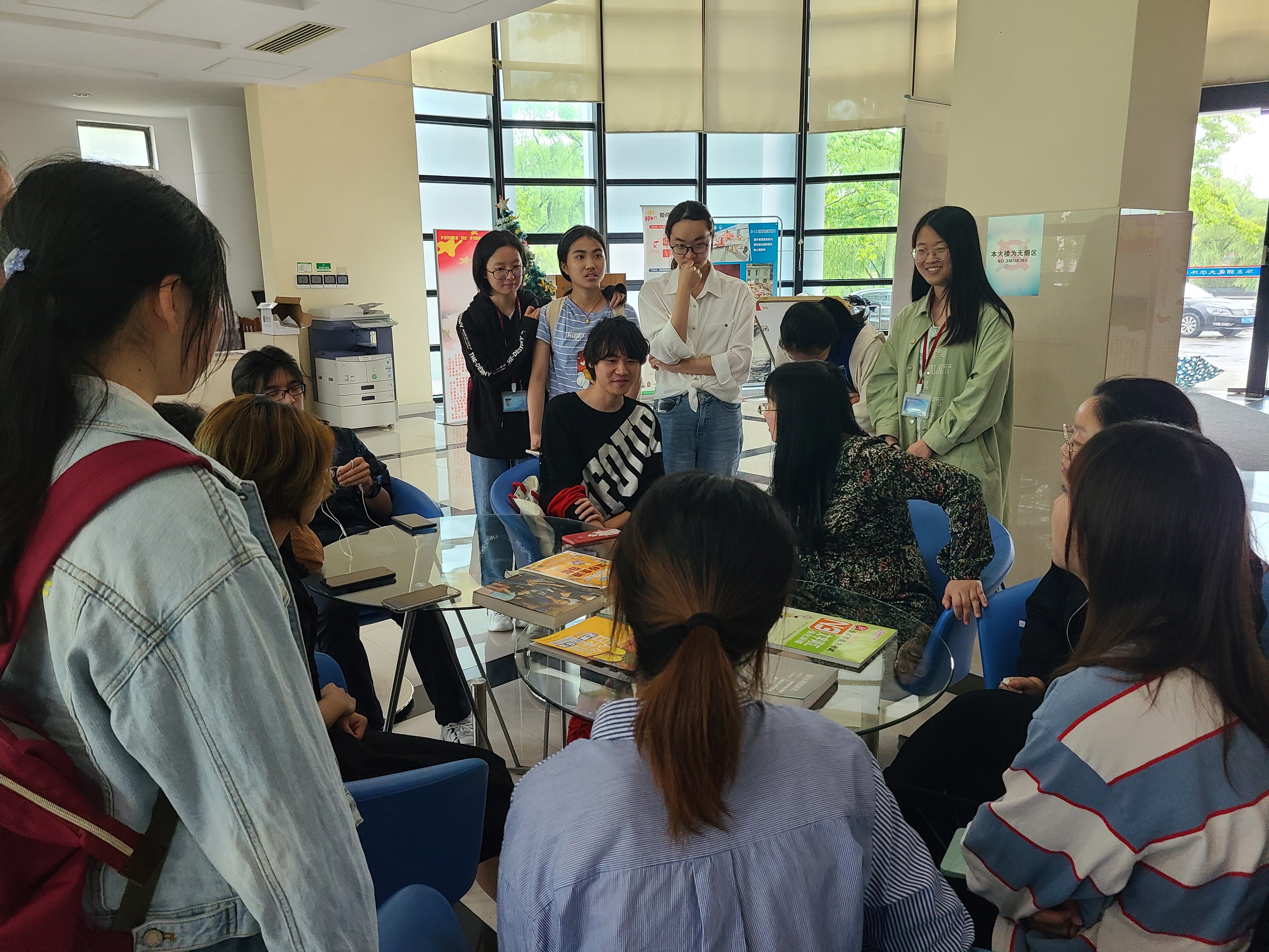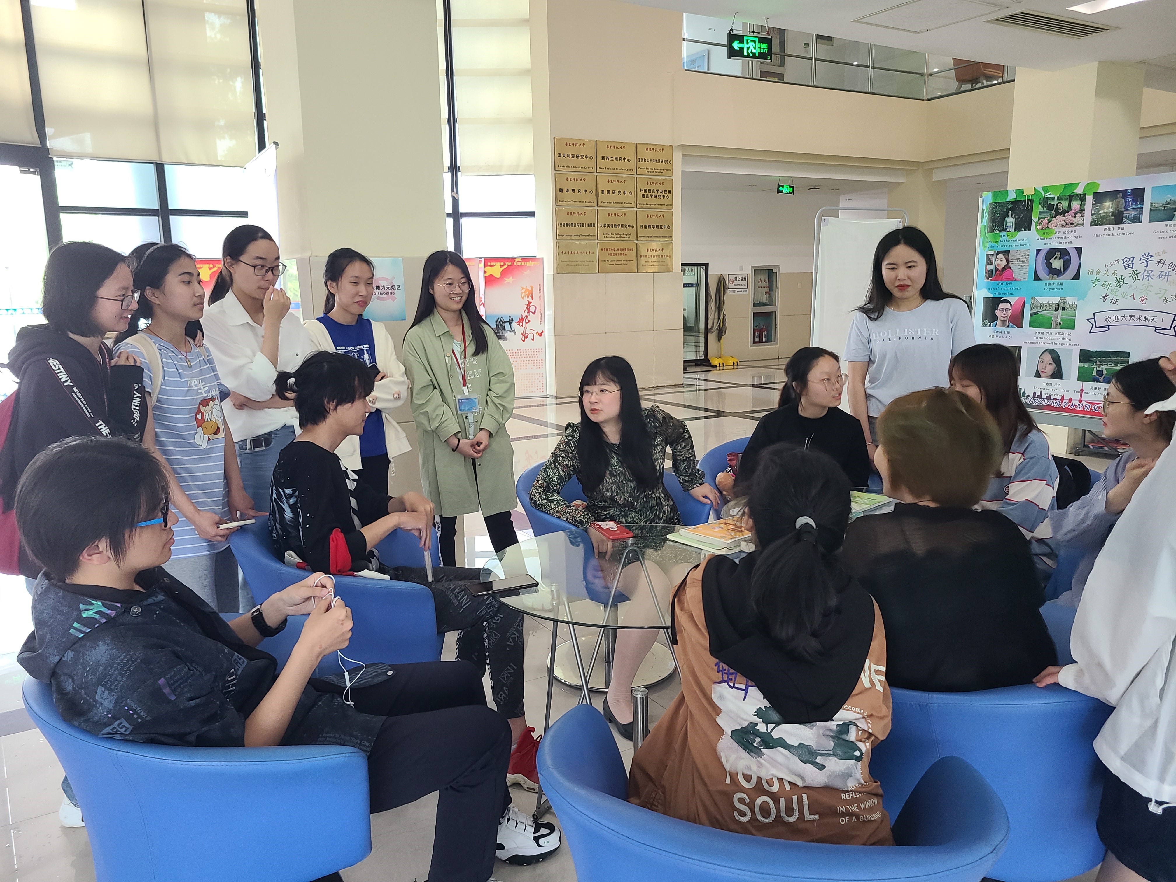5月26日周三中午,即便屋外大雨滂沱,由金晶老师带领的党小组依然如约而至,在外院大厅首次开展了此项活动。党员同志们与学弟学妹们就英语学习和其他学习生活方面展开交流讨论,包括专四,辅修等。党员同志们给出了一些具体的学习方法和学习材料给了大家,例如通过《老友记》等一些优秀的英美电视剧来加强英语口语练习等。在党员同志们就学习方面展开咨询的同时,金晶老师主要就就业择业问题和同学们进行沟通和交流,解答了同学们关于就业的问题,同学们反响很好,希望此类活动继续举行。