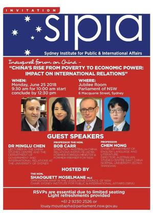 新南威尔士州立法院上议员、悉尼公共与国际事务研究院经理肖凯·莫索曼阁下主持了论坛并发表讲话,指出中国的改革开放带来了重大成就,中国有个中国梦,力求建立一个繁荣、强大、民主、文明、和谐的现代社会主义国家。简言之,是民族复兴、国家领土完整,并得到国际尊重。中国的崛起也将引发世界秩序的改变。