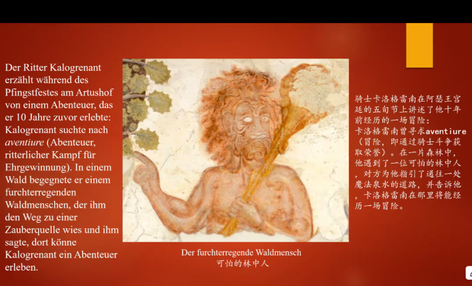 讲座中,van Well老师首先介绍了《伊魏因》的主要情节,它围绕主人公伊魏因的荣誉追求与危机克服展开。伊魏因在失信于妻子后陷入疯狂,逃入森林之中,后来被两个寻求帮助的女子用神奇膏药治愈,恢复神智醒来,在一场独白中怀疑自己的整个骑士生涯不过是一场梦。经历这一转折,主人公不再执着于个人荣誉,而是把冒险与助人相结合,重新赢得了亚瑟宫廷与妻子的接纳。
