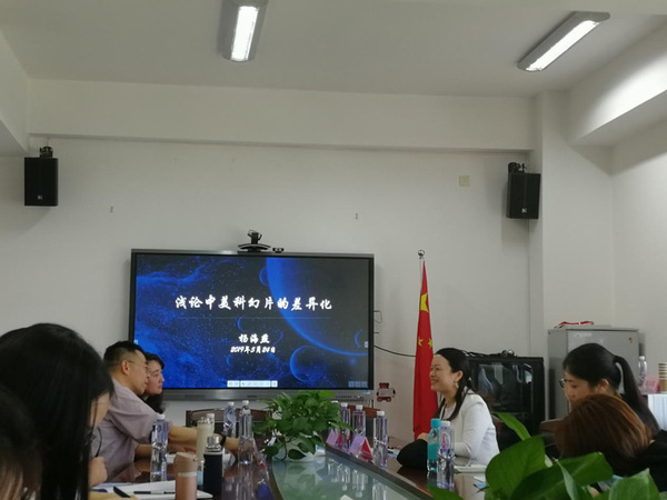 杨海燕老师就“中美科幻片的差异化”为题展开了探讨。《流浪地球》开启了中国科幻电影元年,而片中展现的中式科幻特质更能反映中美不同角度下的科幻视角。杨教授从文化起源、科幻内核、人物形象和影像风格四个方面阐述了这种差异化,并强调中式软科幻的重工业化影像模式与美式硬科幻的轻工业化影像模式之差。之后有同学提问道:“中国人与美国人对科技发展的想象是否也造就了两者影像模式差异的原因”,杨教授回应说《流浪地球》中的重工业化风格主要为导演个人审美原因;而针对“中国人倡导的牺牲小我、成全大我”的价值观念,杨教授答道,有些价值观是全人类共有的,只不过是表达方式的不同。