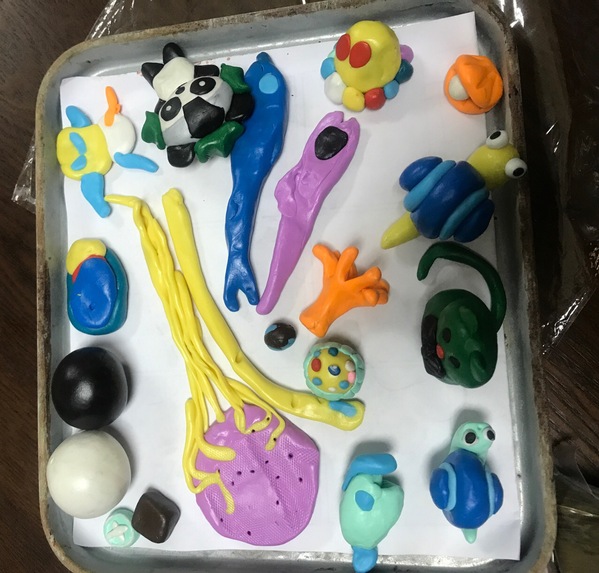 软陶看似橡皮泥,但实际上是一种高分子聚合土,需要烘烤定型。把软陶作品放入烤箱,需要耐心等待15分钟。老师们品尝粽子和水果,聊聊孩子的成长;小朋友们则对着烤箱望眼欲穿,只希望时间过得快一些。随着烤箱“叮”的一声,软陶作品终于成型出炉了。这些色彩斑斓的作品中,不仅有腼腆的黑白一对小猫,还有长着五彩羽毛的猫头鹰,更有小朋友独创的“乱七八糟水母”,千姿百态,栩栩如生。