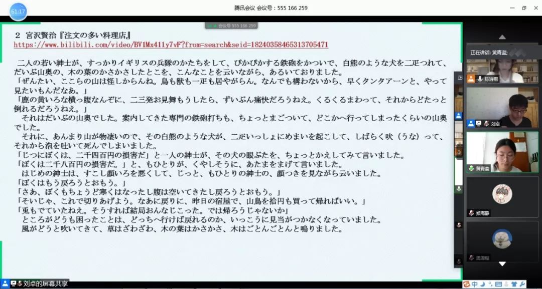 5月20日下午一点,永利yl23411日语系朗读比赛拉开帷幕。今年的这场比赛同往年相比显得有些“与众不同”,因为这是首次在线上举办的朗读比赛。受疫情影响,同学们虽然没能相聚在熟悉的教室里,但在此次线上的朗读比赛中,大家参与的热情依旧不减。日语系的全体老师和1-3年级员工也在现场聆听了比赛。