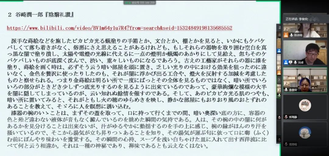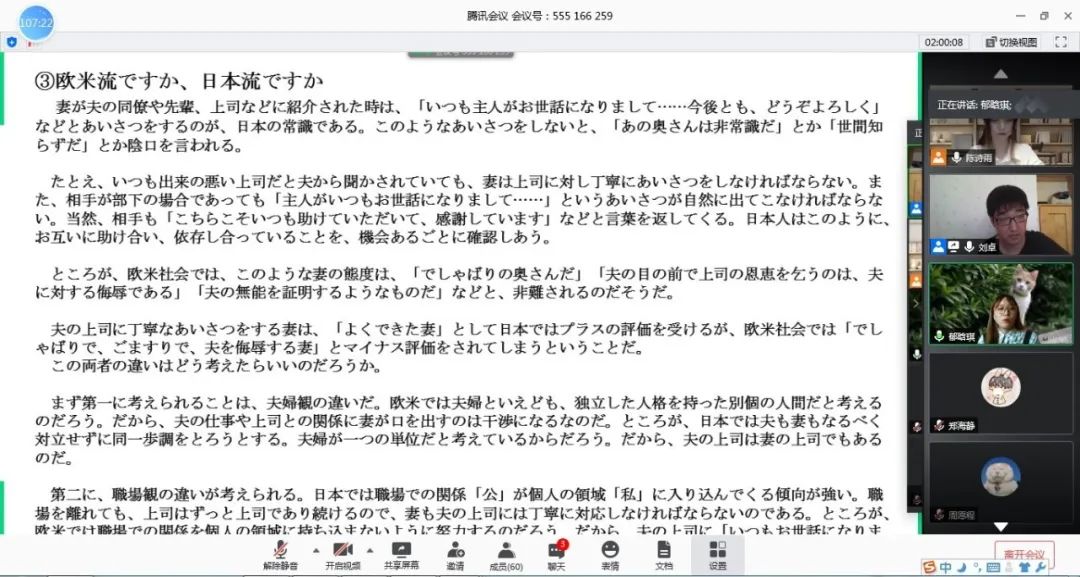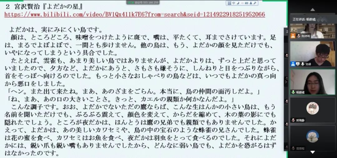 首先,日语系主任尹松老师在致词中说到:“每年的这个时候举行演讲比赛是日语系的老传统了,今年由于特殊情况,改成线上朗读比赛,大家的勤奋练习有目共睹,十分期待看到大家努力练习的成果”。