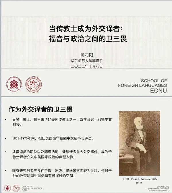 在第二场报告中,帅司阳老师对传教士译者卫三畏的外交及翻译活动进行了讲解。卫三畏(S. Wells Williams)是最早来华的美国传教士之一,长期在美国驻华使团担任译员及中文秘书之职,在早期中美外交中扮演重要角色。帅司阳老师聚焦卫三畏初入使团时期,通过分析一手档案史料,探究了卫三畏在加入使团前后产生的身份认同危机,并进一步讨论了身份认同对他在外交翻译活动中的立场、抉择和处境所造成的影响。