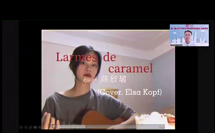 欣赏完老员工的校园生活片段,第二个主题是观看中员工们制作的视频作品。这些作品从全市92件参赛作品中脱颖而出,从多维的角度出发,用法语讲上海故事,介绍了上海的百年发展历程,探讨了上海市15分钟城市生活圈的建设,介绍自己居住环境的变迁,并展示了员工自身的才艺,如自弹自唱法语歌曲、法语配音、自编自导的小短片等,十八般武艺令人目不暇接。