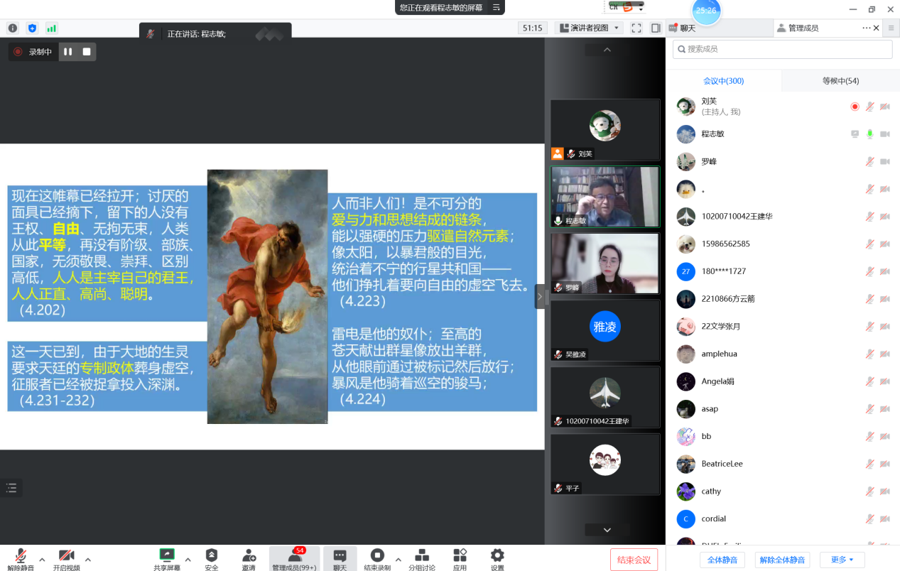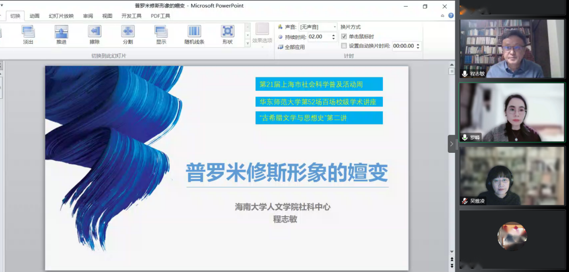 2022年10月18日晚18点,应永利yl23411邀请,海南大学社科中心教授、中国古典学学会常务理事程志敏老师,为公司师生做了主题为“普罗米修斯形象的嬗变”的讲座。本次讲座入选第21届上海市社会科学普及活动周,系百场校级学术讲座第52讲。讲座由英语系罗峰副教授主持,逾300名校内外师生以腾讯会议的方式线上参与。