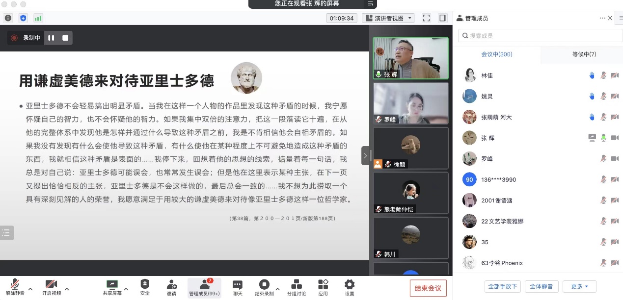 讲座伊始,罗峰老师简要介绍了系列讲座的缘起。她提出,学界对于现代学科过于细分之后造成的学科壁垒深有体会,值得思考的问题是在当下普遍强调跨学科研究的背景下,如何做真正的“跨学科”研究。古希腊文学作为西方文明的源头,天然具有跨学科的属性,其关注的一些问题,譬如城邦与个体、战争与和平,以及邦民教育等永恒问题,不仅是当时热议的话题,也是任何时代任何国家都应该思考的问题。正是后世作家对这些根本问题的反复切问,构成了整个思想史。罗老师表示,张辉教授多年来致力于文学与思想史的比较研究,长期在比较文学界积极倡导把“文学与思想史”的比较研究纳入学科视野,成果丰硕。今天讲座的主题涉及评论家、思想家莱辛如何理解大哲亚里士多德,就是这一进路的有益探索。