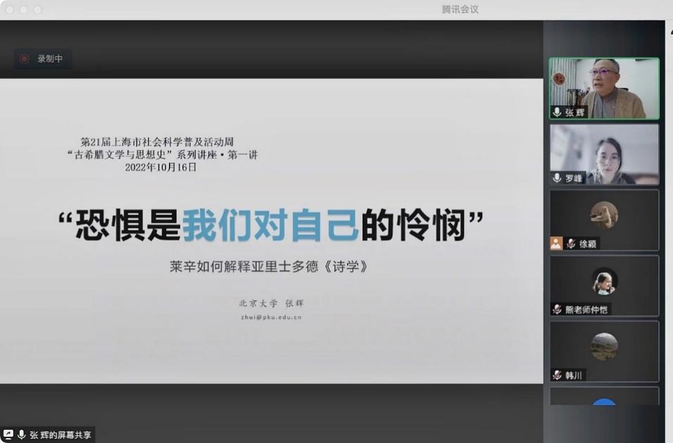 2022年10月16日上午,应永利yl23411邀请,北京大学比较文学与比较文化研究所所长、教授、博导、中国比较文学学会(CCLA)副会长兼秘书长张辉教授做了题为“‘恐惧是我们对自己的怜悯’:莱辛如何解释亚里士多德《诗学》?”的讲座。本次讲座受第21届上海市社会科学普及活动周资助,是“古希腊文学与思想史”系列讲座第一讲。讲座由英语系罗峰副教授主持,共计300余名校内外师生通过腾讯会议在线参与。