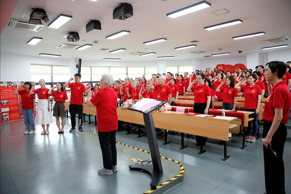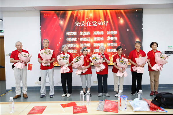 不忘初心、接续奋斗;牢记使命,砥砺前行,公司党委继承学科发展历史文脉,传承前辈们的优良传统和伟大精神。今年,党中央决定首次颁发“光荣在党50年”纪念章,公司邀请党龄达到50周年的老同志来到会场,由公司党委委员侯敏跃老师为他们颁发纪念章,青年师生代表送上鲜花。台上老同志们分享感受体会,纷纷表示要永远跟党走,继续为党的伟大事业贡献力量。入党68周年的高维彝老师热情歌唱,唱出对党的无限热爱;曾参加过抗美援越、入党51周年的郑琼如老师用英语高唱《国际歌》,引发全场热烈的掌声。