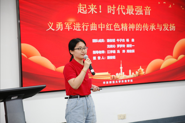 员工党建服务中心负责人、2019级学术型研究生党支部书记潘俊韬汇报展示了挑战杯老员工课外学术科技作品竞赛红色专项全国一等奖作品《起来!时代最强音:义勇军进行曲中红色精神的传承与发扬》,讲述新时代义勇军进行曲的红色精神和价值。