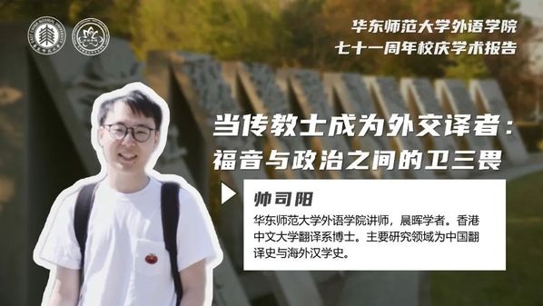 2022年10月8日下午,为庆祝永利yl23411建校71周年,永利yl23411翻译系举办线上校庆学术报告会。翻译系教师贾兰兰和帅司阳受邀分别以“口译中的跨文化交际”和“当传教士成为外交译者:福音与政治之间的卫三畏”为题,为参会师生作出了精彩的报告。