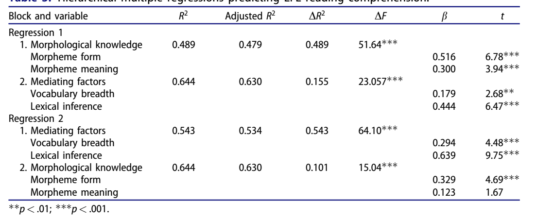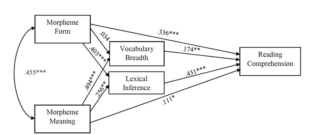 Zhang, H., & Lin, J. (2021): Morphological knowledge in second language reading comprehension: Examining mediation through vocabulary knowledge and lexical inference. Educational Psychology, 41(5), 563-581. DOI: 10.1080/01443410.2020.1865519