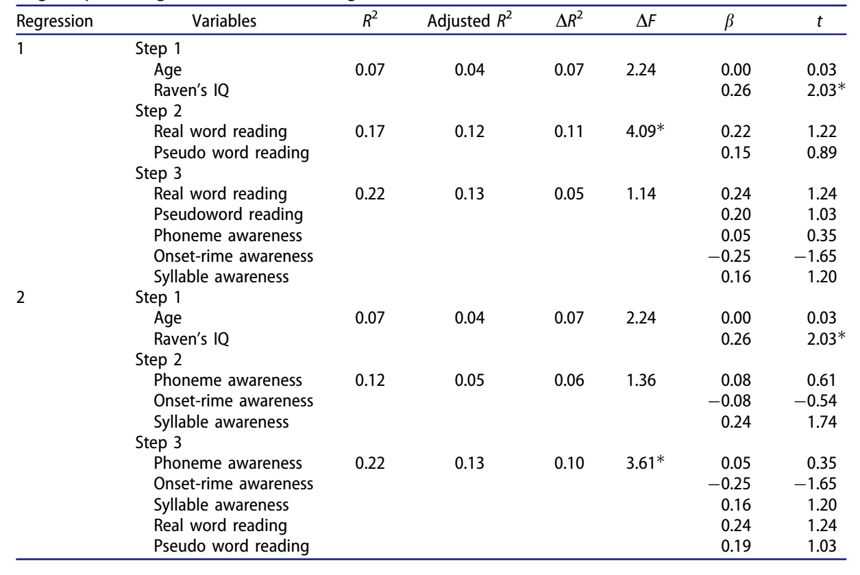 分层回归分析的结果进一步证明了语音意识和语音编码能力对于高阶读写能力的语言内和语言间的长期预测作用。具体而言,有以下两个重要研究发现: