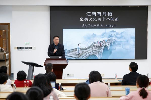 仪式开始前,黄岩区政协党组成员、秘书长张良作主题为“江南有丹橘:宋韵文化的十个侧面”文化讲座。宋代是黄岩文化发展黄金期,产生了独有的非同凡响的气度与韵味,使黄岩成为宋韵文化的集大成者。张良详细介绍了黄岩以文化复兴战略为动能,以擦亮“千年永宁·宋韵黄岩”品牌为重点,梳理出的最具辨识度的宋韵文化的十个侧面,带领听众充分领略了千年黄岩的宋韵风采。