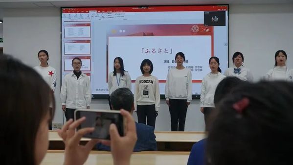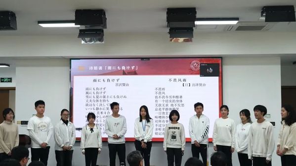 日语系一年级的员工们也通过诗朗诵和合唱节目为日语专业成立五十周年送上了祝福。日语系2022级王弈烜等12位同学用中日双语朗诵了宫泽贤治的名作《不畏风雨》(雨にも負けず),随后2022级的陈奕涵等8位同学带来日本的经典童谣《故乡》(ふるさと),在深情的朗诵与悠扬的歌声中,一年级员工们不仅表达了对日语系生日的祝福,也传达出了自己对日语的热爱以及学好日语的决心。