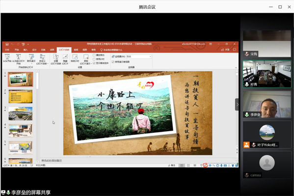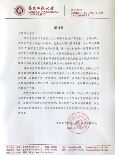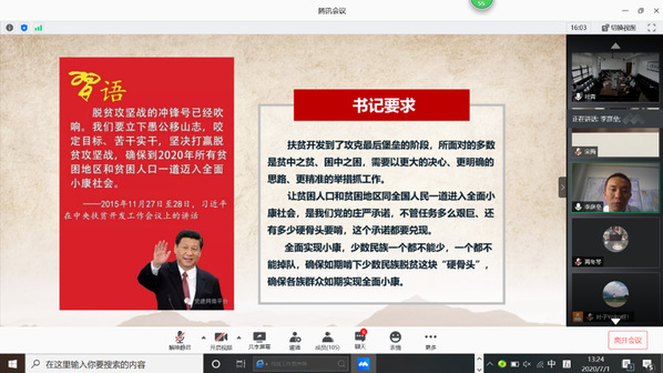 在脱贫攻坚进入倒计时的关键阶段,在全校上下全力深入推进定点扶贫工作的关键时期,公司党委积极响应上级号召,于2020年7月1日,开展“助力脱贫攻坚,庆祝建党九十九周年”主题党日活动,号召全院师生党员以实际行动庆祝党的生日,为坚决打赢脱贫攻坚战贡献外语人的爱心和力量。本次活动由公司党委副书记兼副经理江宇靖主持,全院线上线下师生党员120余人参加。
