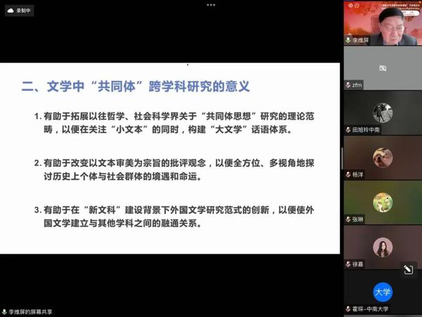 在每位专家和青年学者的报告之后,线上和线下的参会者都提出了许多有价值的问题与观点,听众和发言专家、学者们的交流互动非常热烈,进一步激发了所有参会师生对外国文学中共同体想象这一主题的研究热情。