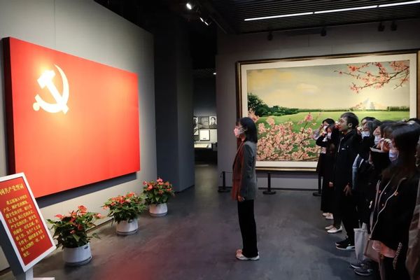 在纪念馆内,支部为新发展的预备党员举行了入党宣誓仪式,支部其他成员也跟随重温入党誓词,本科生党支部书记侯嫣茹老师领誓。在鲜红的党旗面前,师生党员庄严宣誓。铿锵有力的誓词回响中,师生党员们牢记使命担当,汲取奋进力量,更加坚定了继承烈士遗志,赓续红色血脉,为共产主义奋斗终身的理想信念。