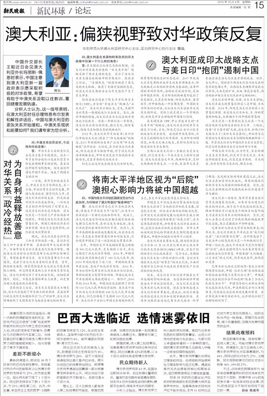 分析人士认为,这一信号表明,在澳大利亚时任总理特恩布尔发表和解性讲话后,中国与澳大利亚的紧张关系开始缓和。中澳关系现状和前景如何?我中心主任陈弘在《新民晚报》“新民环球”发表评论,对此问题进行了深入的分析和阐述。