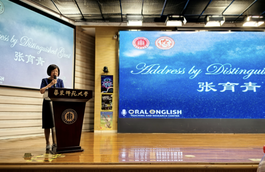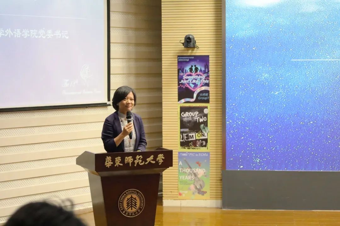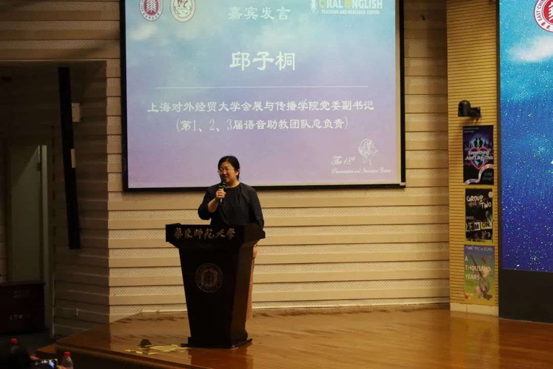 2007年首届语音助教团队第一负责人、现任上海对外经贸大学会展与传播公司党委副书记邱子桐老师上台发言。她简要回顾了当年参与语音语调大赛的经历,表达了对那段青春时光的怀念,并对比赛延续至今、不断发展表示欣慰与祝贺,同时鼓励同学们珍惜平台,不断追求卓越。