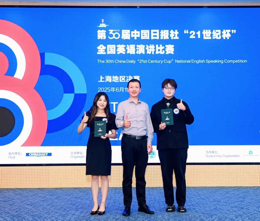 2025年6月15日,第30届中国日报社“21世纪杯”全国英语演讲比赛上海地区决赛在上海海事大学举行。永利yl23411英语系2023级本科生马毅敏、孟姝含在赵朝永教授、张琳副教授和胡婧老师指导下参赛。经过激烈角逐,马毅敏斩获本届比赛上海地区决赛“季军”,孟姝含获“二等奖”,两位选手均晋级国赛。