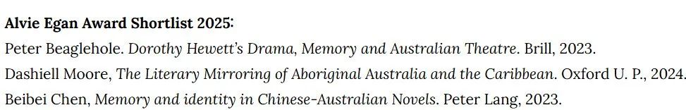 近日,澳大利亚文学研究协会(ASAL)公布了2025年度Alvie Egan文学评论奖提名名单,公司晨晖学者陈贝贝老师的学术专著Memory and Identity in Chinese-Australian Novels成功入围,成为该奖项设立以来第二位获提名的非英语国家研究者,标志着中国学者在澳大利亚文学研究领域的国际影响力日益提升。