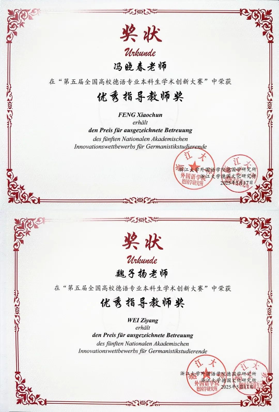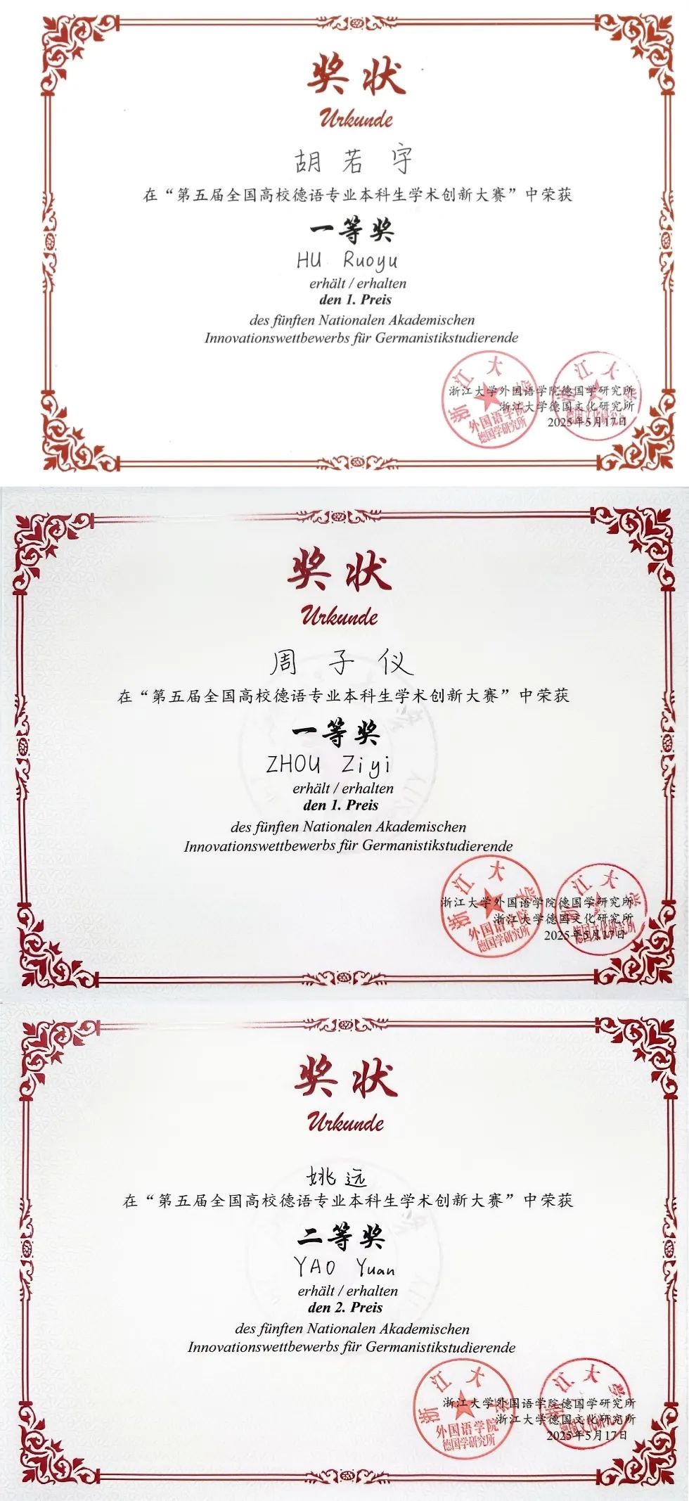 2025年5月17日,第五届全国高校德语专业本科生学术创新大赛决赛暨本科生学术论坛在浙江大学紫金港校区成功举行。本届大赛中,德语系2021级本科生胡若宇获文学赛道一等奖,2021级本科生周子仪获跨文化与区域国别赛道一等奖,2022级本科生姚远获文学赛道二等奖。德语系冯晓春副教授、魏子扬博士获优秀指导教师奖。自2021年首届赛事启动以来,公司德语系学子已连续五年积极参赛,今年首次进入决赛并取得历年来最好成绩,充分展现了德语专业在本科教育领域的深耕成果,通过创新教学模式有效激发了员工的学术潜能。