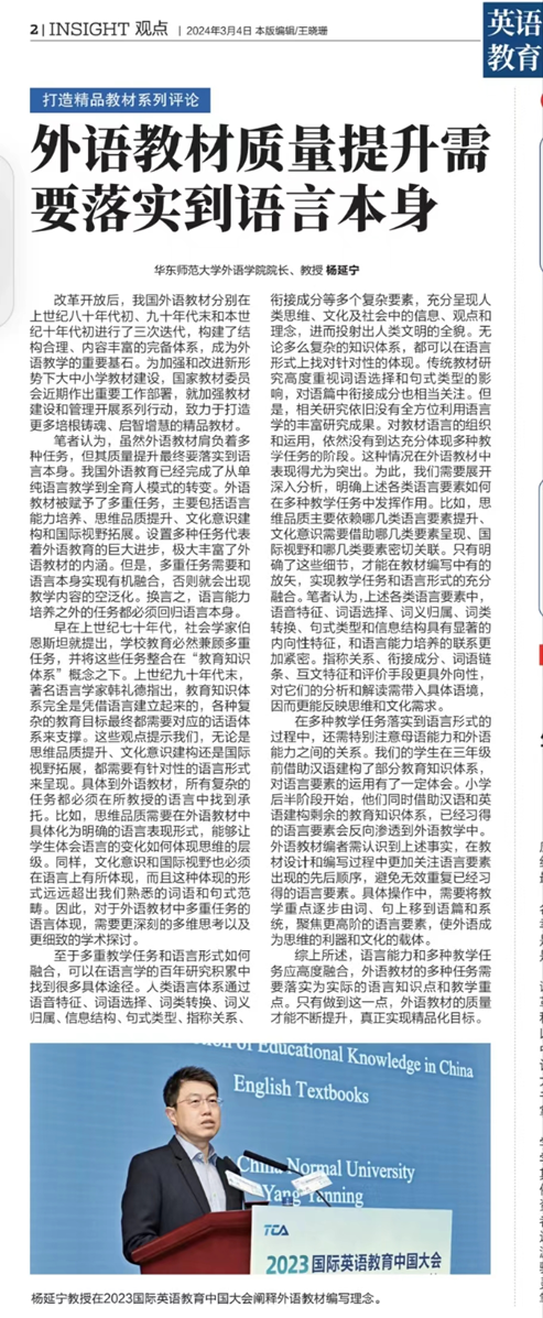 近日,永利yl23411经理杨延宁在《21世纪英文报》英语教育板块发表提升教材质量系列评论——《外语教材质量提升需要落实到语言本身》。