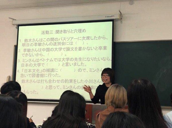 在交流活动中,尹松老师和尤海燕老师介绍了日语专业的课程设置、课时安排及交换留学等本科生相关的教学情况。彭瑾老师和杨敬老师就目前在低年级开展的活动型教学和任务型教学做了较为详细的介绍。之后双方就共同关心的问题进行了深入的交流和探讨。杉达大学的老师们表示聆听两位老师的课堂深受启发,受益匪浅。表示希望今后两校能加强交流,能够定期举行教学交流会。