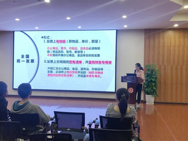 接下来,办公室的赵楠学姐讲解了公司的财务制度和员工会的财务管理细则,主要包括员工会的各项活动的报销流程、预算申请和决算等方面。讲述的全程细致生动,PPT内容也简洁易懂。