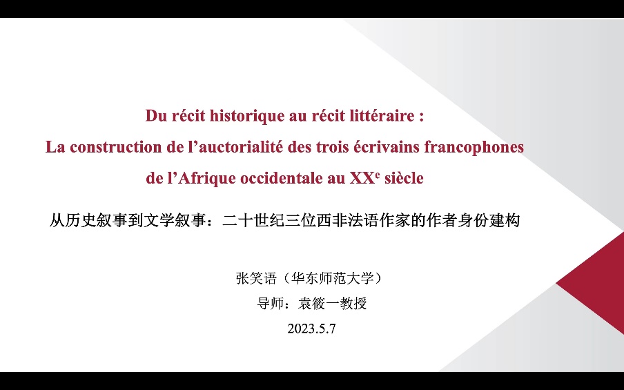 张笑语同学的论文《从历史叙事到文学叙事:二十世纪三位西非法语作家的作者身份建构》以二十世纪三位西非法语作家的作品为研究对象,结合思想家对历史真实与文学虚构之间关系的论述,梳理了三位作家通过改写西方经典、解构西方语言、呈现当地小人物视角等方式,完成从民族志写作到文学创作、从历史叙事到文学叙事的跨越,表达本民族文化身份诉求,并最终获得作者身份的曲折过程。