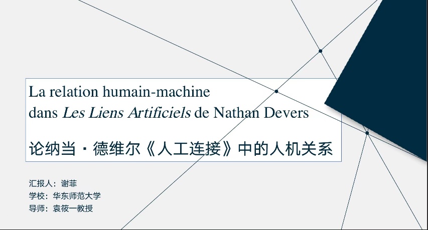 公司法语系2021级博士生谢菲同学的论文 « La relation humain-machine dans Les Liens artificiels de Nathan Devers »(《论纳当德维尔《人工连接》中的人机关系》)顺利通过初审,并在论文展示和答辩环节以优异表现得到评委老师们的高度评价,最终喜获博士生分论坛一等奖。2022级博士生张笑语同学的论文« Du récit historique au récit littéraire : la construction de l’auctorialité des trois écrivains francophones de l’Afrique occidentale au XXe siècle »(《从历史叙事到文学叙事:二十世纪三位西非法语作家的作者身份建构》)与2022级博士生袁丝雨同学的论文« Du postcolonialisme au posthumanisme : le problème de la frontière dans Nulle part dans la maison de mon père et Klara et le soleil »(《从后殖民到后人类:论《在父亲的家中无容身之地》和《克拉拉与太阳》中的边界问题》)同样表现出色,均喜获博士生分论坛二等奖。