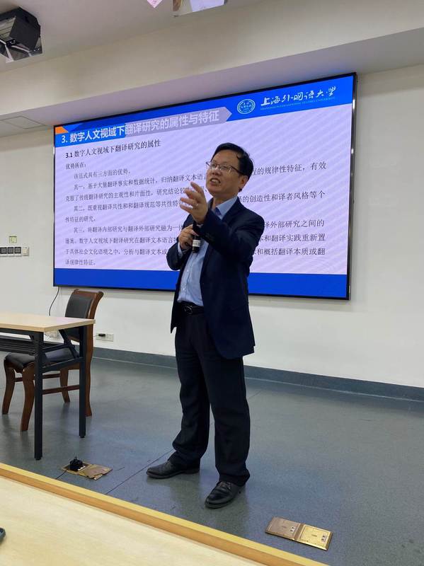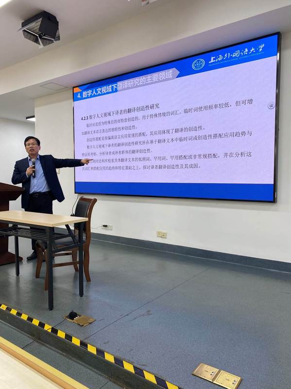 随后,胡开宝老师结合自己的课题项目,介绍了数字人文视域下翻译研究的属性与特征、主要领域(翻译文本研究、译者研究、翻译史研究与翻译教学研究)以及数字人文视域下翻译研究的意义。