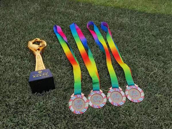 看!我们得的奖杯和奖牌。