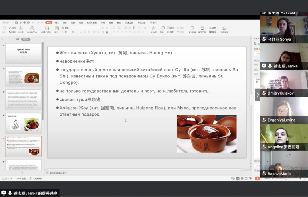 研讨会下半场主题为中国菜名文化图景,徐志颖、胡美琪、郝宇三位同学分别介绍了东坡肉、佛跳墙、宫保鸡丁这三道中华经典美食。徐志颖同员工动再现了东坡肉与东坡先生的历史渊源,道出美食背后的文化内涵;胡美琪同学介绍了“佛跳墙”如何从原先的名称“福寿全”发展而来,全新的名称又有何含义;郝宇同学别出心裁地在分享最后附上宫保鸡丁的制作方法,建议感兴趣的俄罗斯同学在家中尝试。