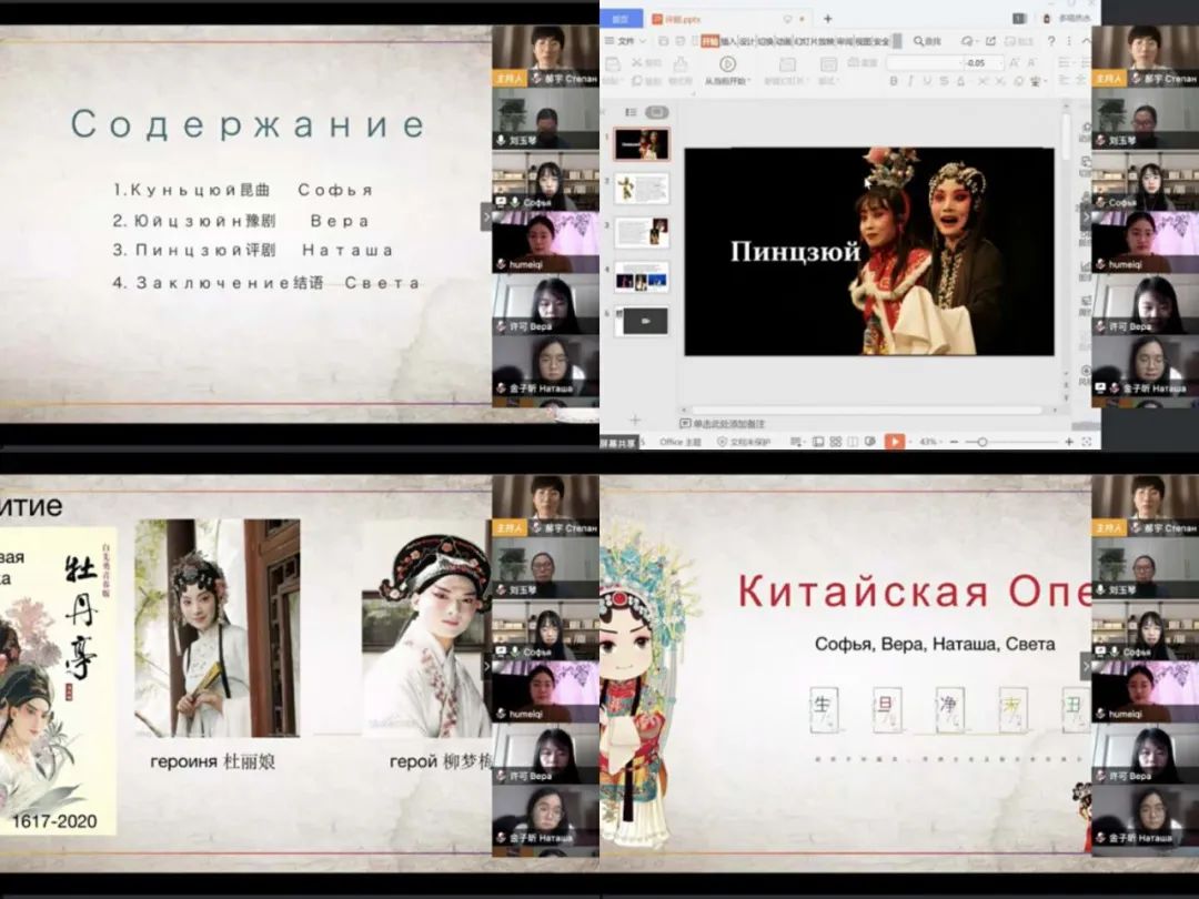 研讨会上半场主题为京剧特点及京剧在俄罗斯的接受,金子昕、许可、张智媛、张宇星同学分别从评剧、豫剧和昆曲等地方剧种入手,将地方剧和京剧的形式异同与文化联系进行对比。金子昕同学从“莲花落”引出评剧的历史根源;许可同学介绍了《花木兰》、《穆桂英挂帅》、《秦雪梅》等豫剧经典剧目;张智媛同学通过“青春版牡丹亭”道出现代昆曲的改革创新,对如何在新时代发展传承传统戏剧进行思考;张宇星同学对三位同学的分享进行总结,引入“京剧”主题,介绍了京剧历史、传统剧目、传承和创新方式以及域外传播情况。四位同学配合图片和音视频资料生动讲解,让俄罗斯朋友领略到中国戏曲丰富的地方性特色、悠久的历史文化底蕴以及京剧国粹的魅力所在。