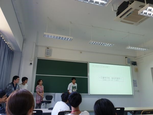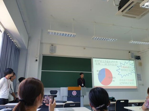 接下来是经济组带来了发表。有同学对中国手机使用情况进行了发表,还有分析支付宝等手机支付能够在中国普及的原因的同学。有名同学分析了电子支付在日本市场不受欢迎的原因,并选定一家超市进行了现场调查,统计了一个小时之内有多少人是手机支付,有多少人是现金支付,最后总结中国市场和日本市场的现状。
