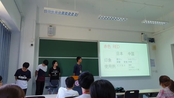 在于老师的一番介绍之后,日本员工们开始了他们精彩的发表。最先上场的是文化组。其中有的人对颜色的文化进行了中日比较,还有的人对上海与日本的建筑进行了比较与分析。