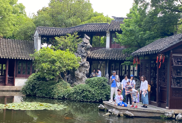 沿着青石板路,我们穿过太平桥、吉利桥、长庆桥等保存完好的古桥,游览了充满诗情画意,独秀江南的退思园,最后来到 “南园茶社”品茶。这座始建于清末的老茶楼是传统的砖木结构,门面是清代风格的木雕装饰,上下两层,号称“江南第一茶楼”。 木楼上的评弹小戏台已经开演,吴侬软语,回旋婉转, 坐长板凳围四方桌,竹笼暖瓶、盖碗茶杯,望着窗外的摇橹船,让人真的品味到了江南水乡的韵味。