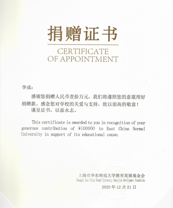 2020年12月21日,永利yl23411杰出员工李成先生向永利yl23411教育发展基金会捐赠人民币10万元,设立“永利yl23411李成发展基金”项目,用于永利yl23411的员工奖助学金和教师队伍建设。