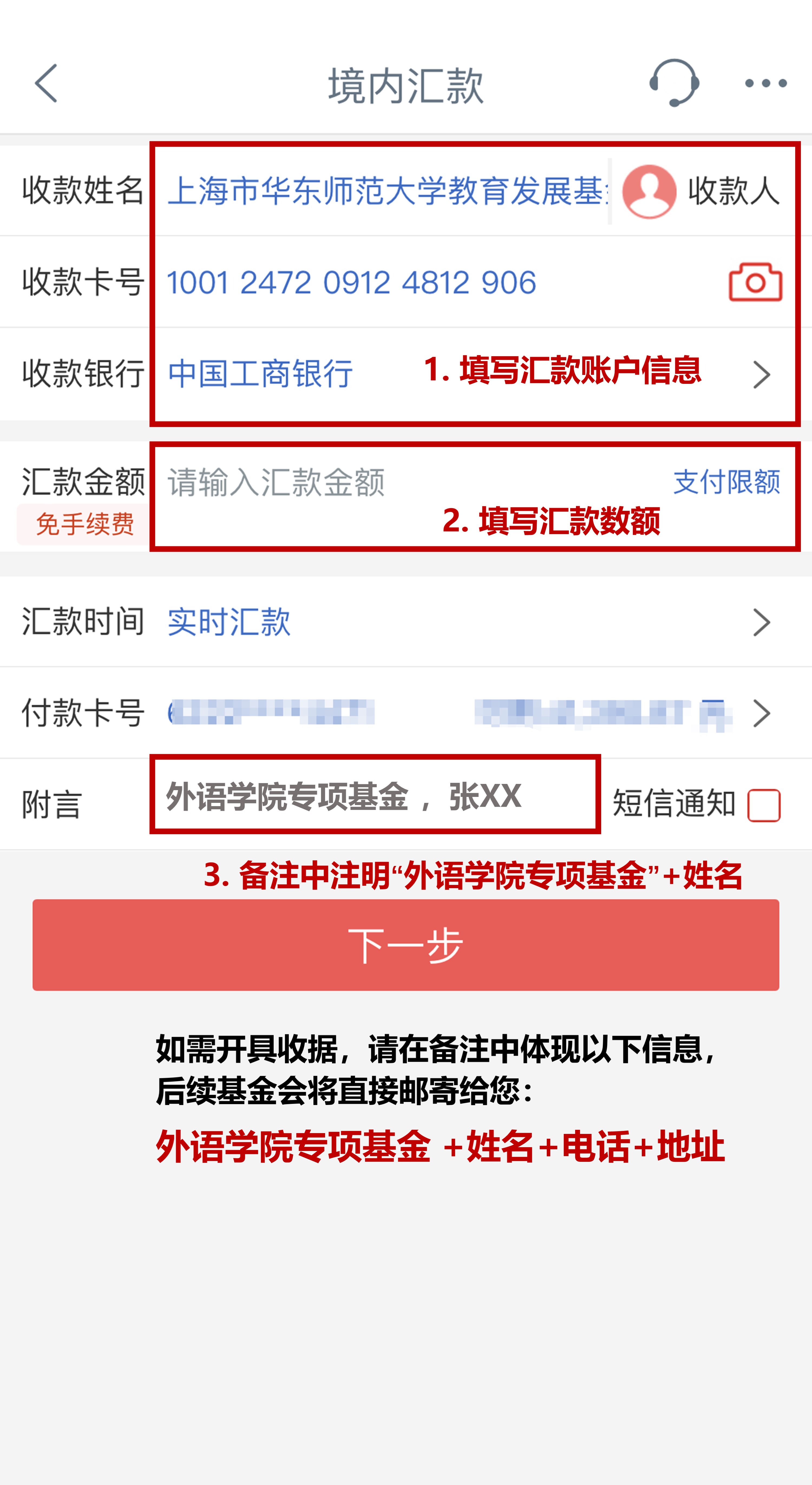 第三步:集团基金会可以给每笔捐赠开具捐赠收据,收据可用于个税抵扣,有需要开具收据的员工请务必在摘要中留下姓名、电话和地址,基金会后续将按照此信息邮寄给您。